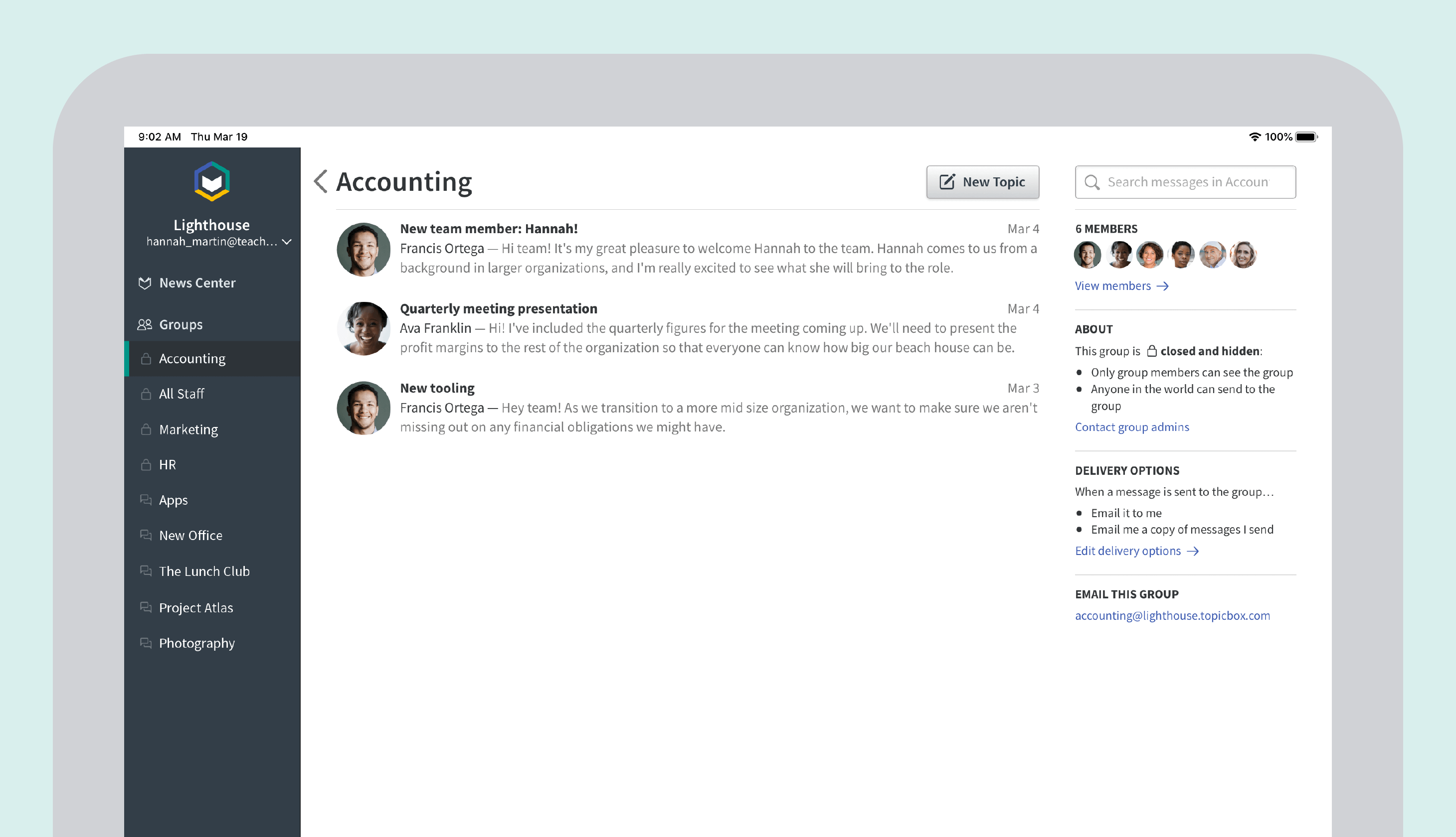 If you're the admin of a Topicbox organization or group, you can conveniently edit your settings using mobile apps. Approve held messages, create new groups, and update your group’s settings from anywhere. Topicbox help teams to adapt to remote work quickly and apps support a smooth transition.